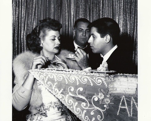Lucille Ball and Jerry Lewis never acted on film or television together, but they did sometimes appear on the same TV specials or award shows. Lucy often appeared with Lewis’s former comedy partner Dean Martin, whose son was in a band with Lucy’s son, Desi Jr. In the above photo, Lewis and Ball share cake at the fourth anniversary of the Sands Hotel and Casino in Las Vegas in 1956.