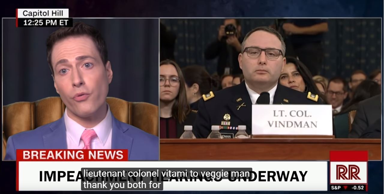 Randy Rainbow’s impeachment video starts with him referring to witness Vindman as “Lieutenant Colonel Vitameatavegamin” (although the phonetic closed captions spell it wrong)! To watch the video, click here.